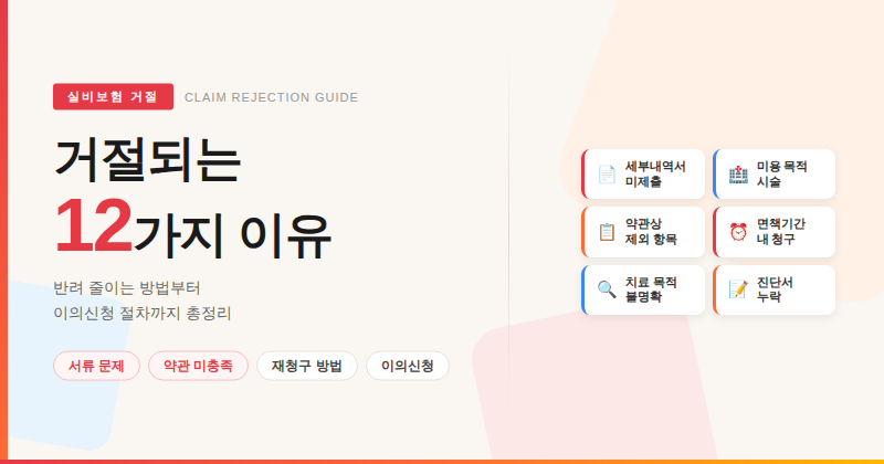 실비보험을 청구했는데 거절 통보를 받으셨나요? 대부분의 거절은 약관을 몰라서, 또는 서류가 빠져서 발생합니다. 이 글에서는 실비보험이 거절되는 대표적인 12가지 이유를 원인별로 분류하고, 각각의 대처법과 청구 전 체크포인트까지 함께 정리했습니다.